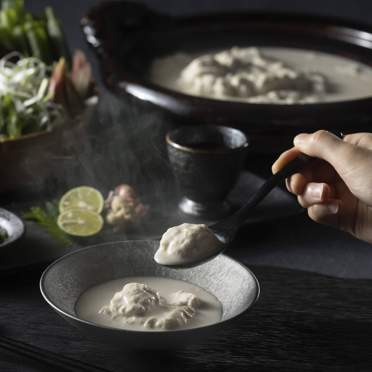とろりとろける湯豆腐を楽しんだら、具材を入れてお鍋にしたり、しゃぶしゃぶをいただいても。そして最後のお楽しみにご飯を入れて雑炊やリゾットをどうぞ。コースのようにして何度も楽しめます。